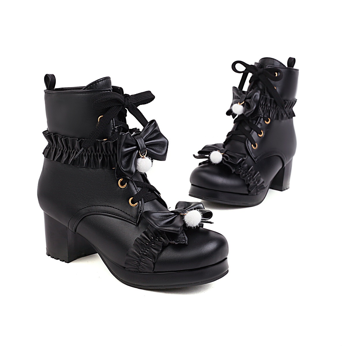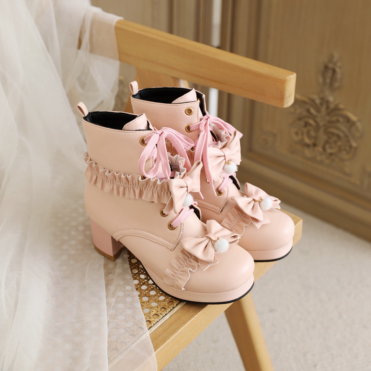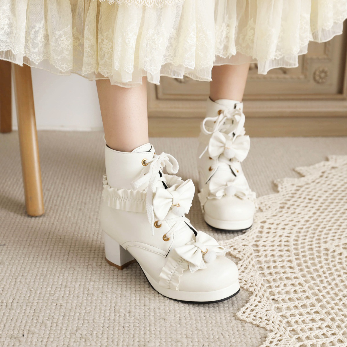 Bowknot Boots With Front Lace Up Thick Heel Short Boots