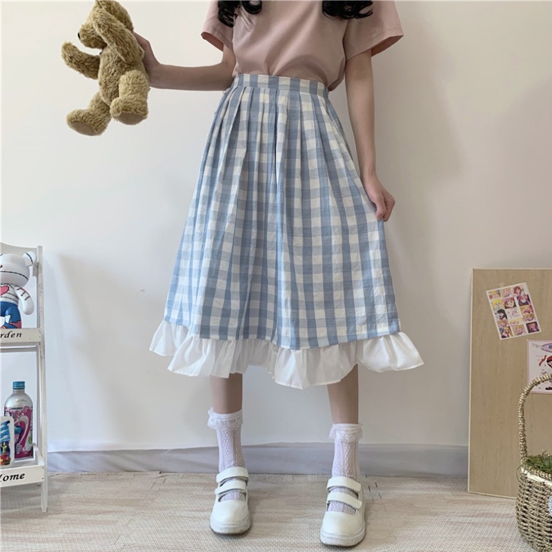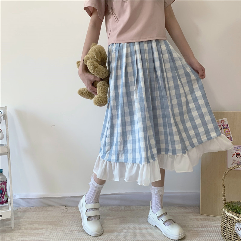Japanese Cute Soft Girl Student Mid-length High-waist Ruffled Plaid Bust Skirt