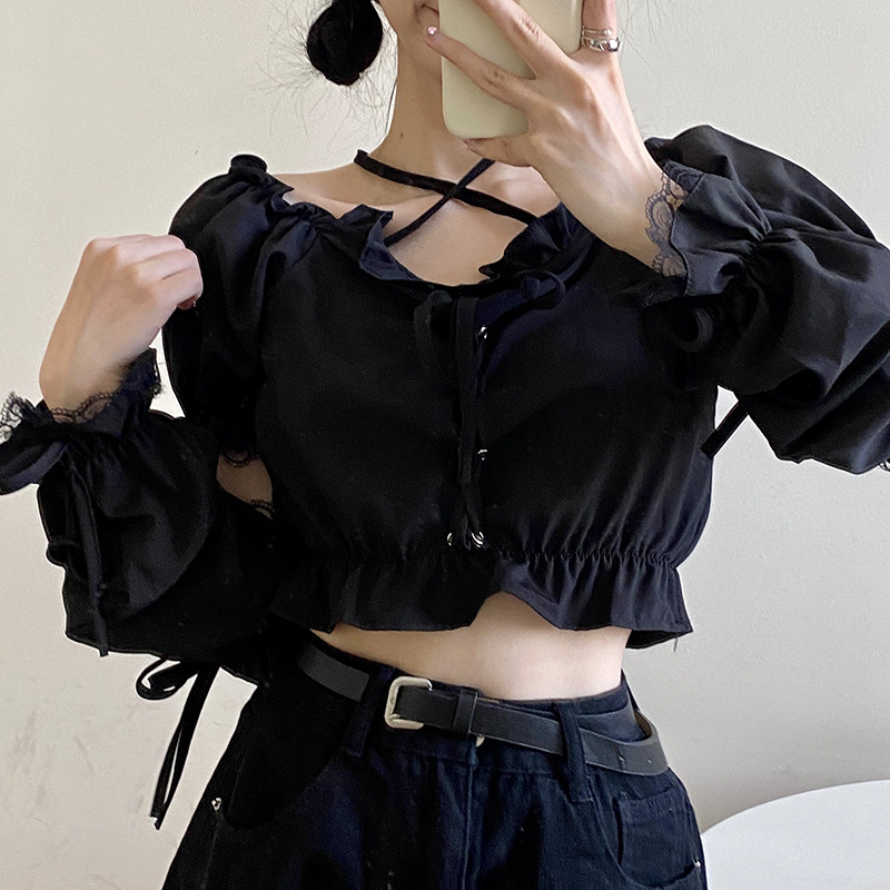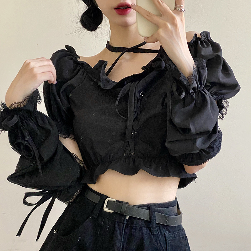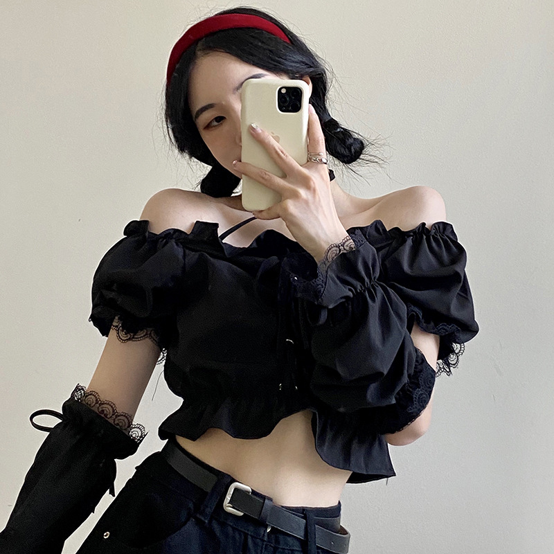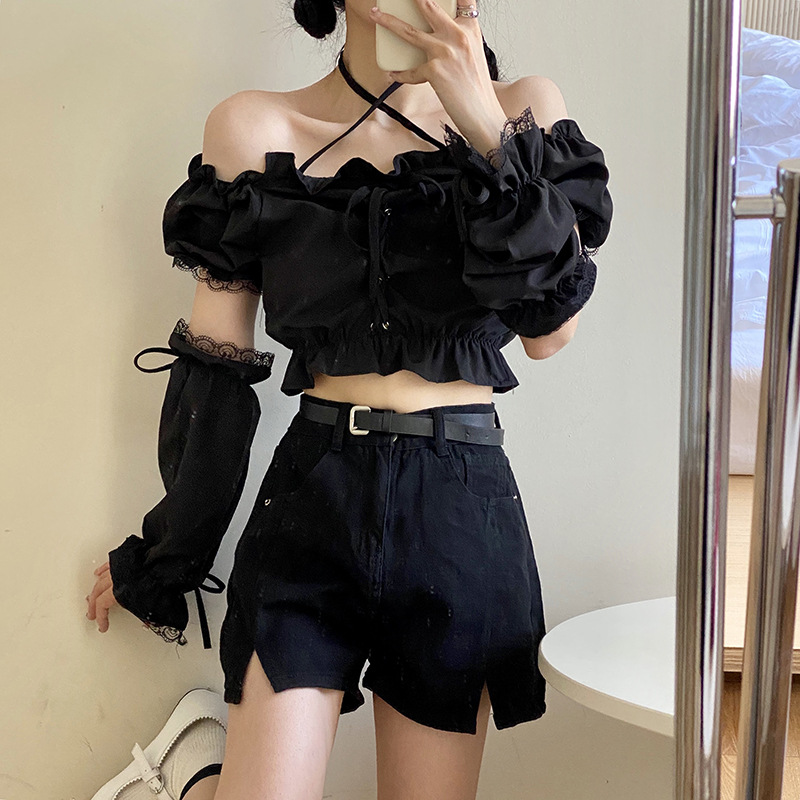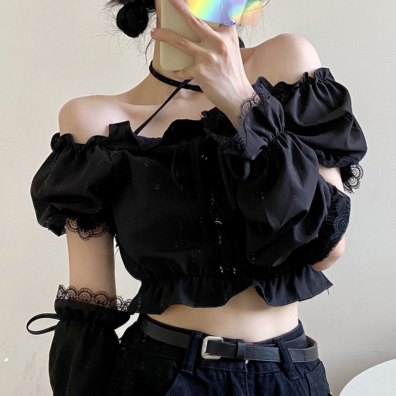 Side Sleeves Lace Halter Neck One-shoulder Puff Sleeve Strapless Top T-shirt